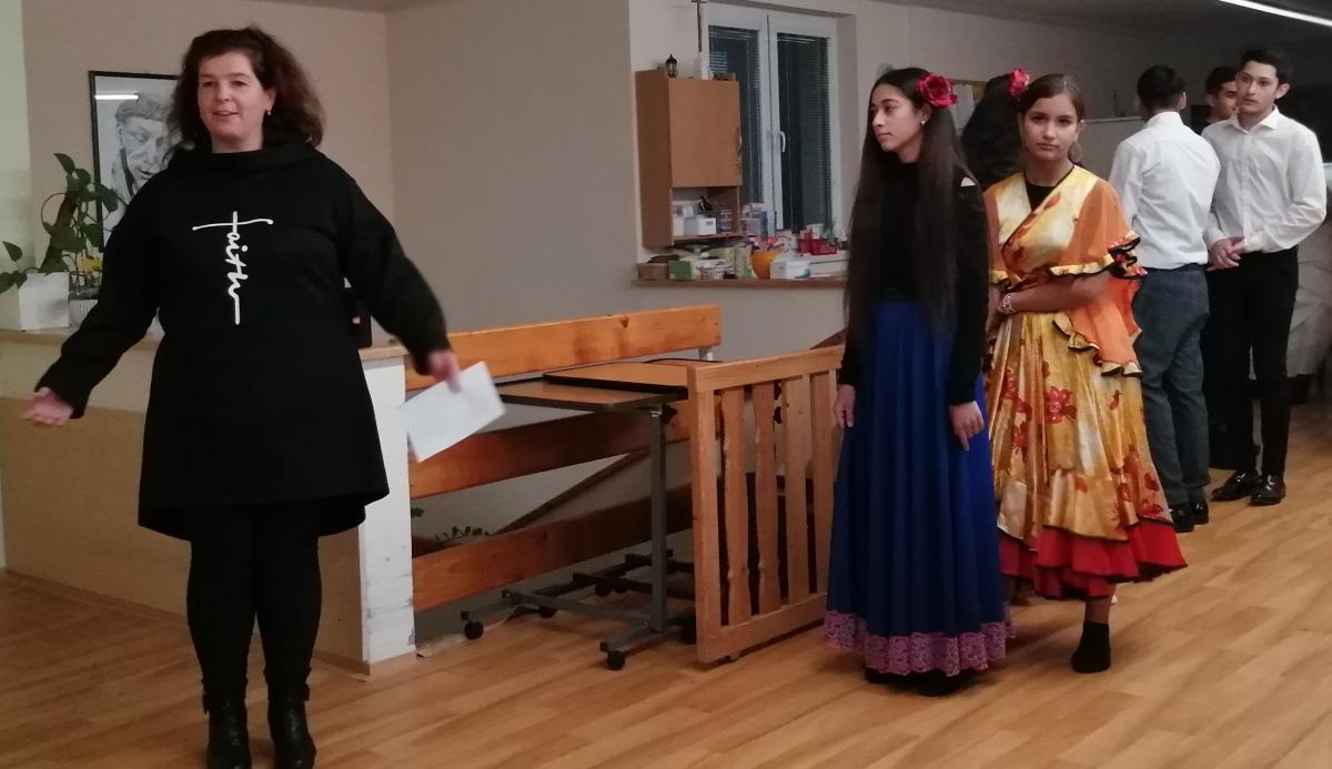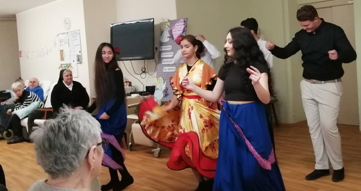 Kultúrny program otvorila vianočná báseň, ktorá navodila sviatočnú atmosféru. Po úvodných slovách predviedla šestica tanečníkov v krásnych tradičných odevoch energické rómske tance. Ich pohyb a nákazlivý rytmus rozveselili prítomných divákov, ktorí účinkujúcich odmenili srdečným potleskom a úprimnými úsmevmi.