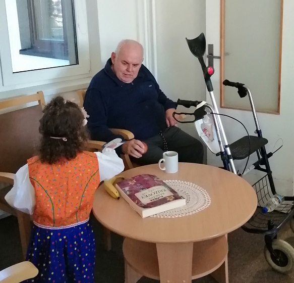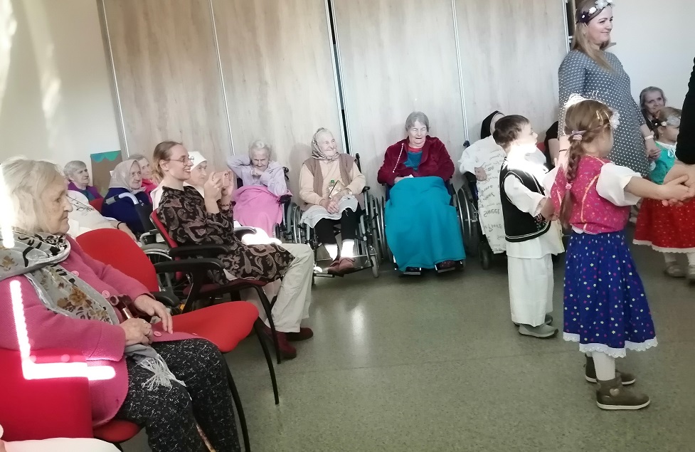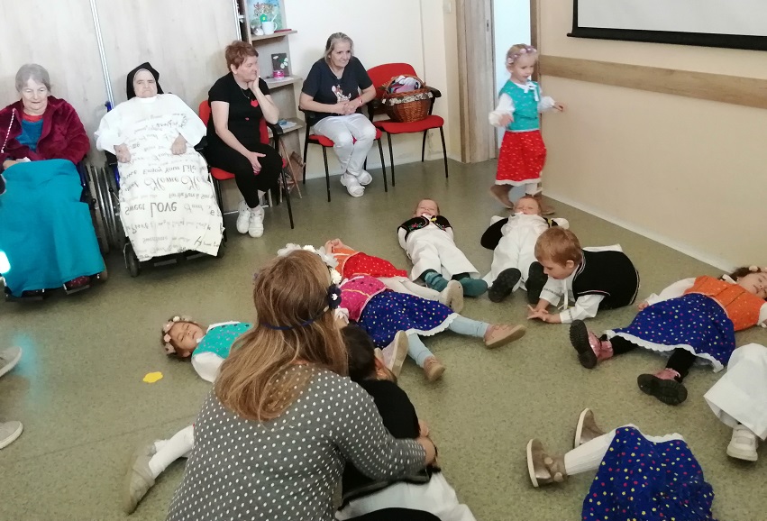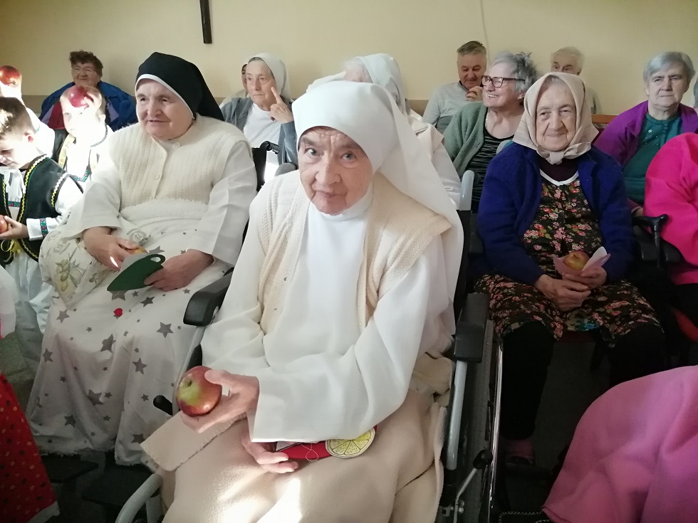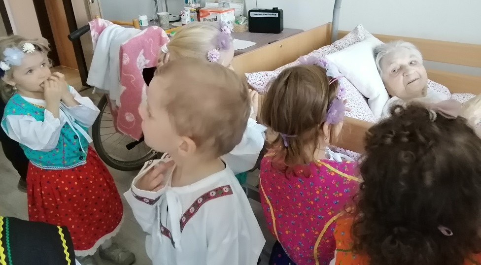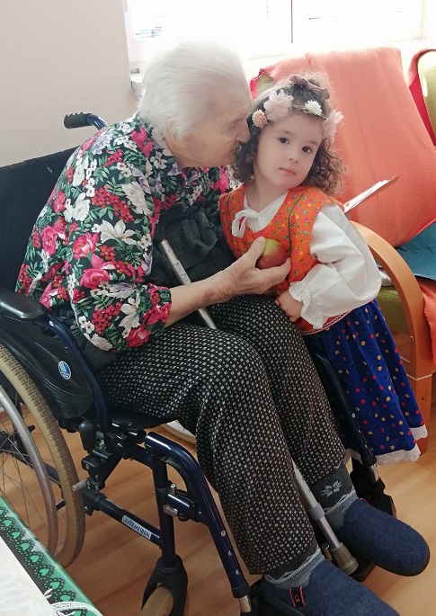Po skončení programu všetky „motýliky“ s úprimným darom v ruke pristúpili k babkám a dedkom. Odovzdali im symbol lásky a zdravia – jabĺčko zo záhradky a ručne vyrobený papierový hrnček s vrecúškom čaju. Deti nezabudli ani na ležiacich na izbách. Navštívili všetkých, ktorí prísť nemohli a priniesli im radosť.