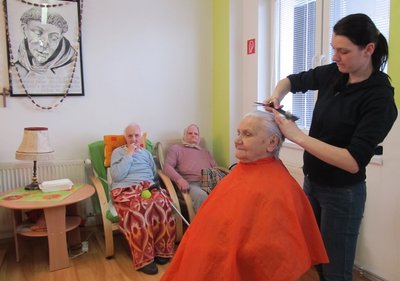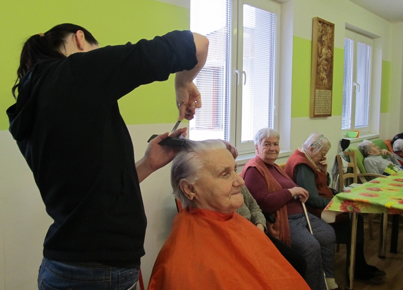 Chceme sa s Vami podeliť ešte o jedno tajomstvo z nášho života v Domove sv. Dominika. Každé dva mesiace k nám chodí pani pedikúrka a pani kaderníčka. Obe sú veľmi milé. S veľkou zručnosťou a odbornosťou nám pani Eva dá do poriadku naše choré a boľavé nohy a mladá pani Lenka – dobrovoľníčka, robí krátky proces s našimi, stále rastúcimi, vlasmi.